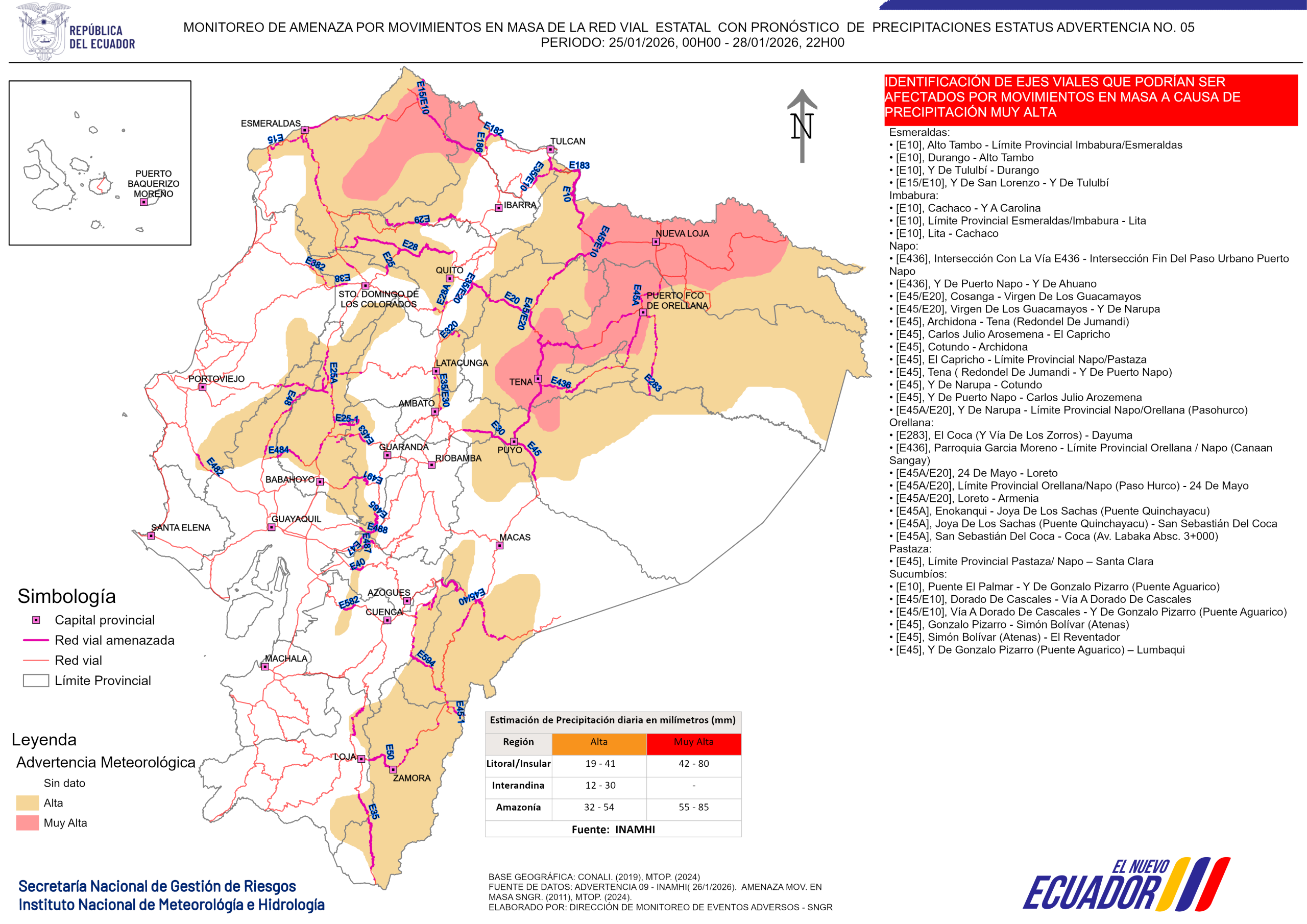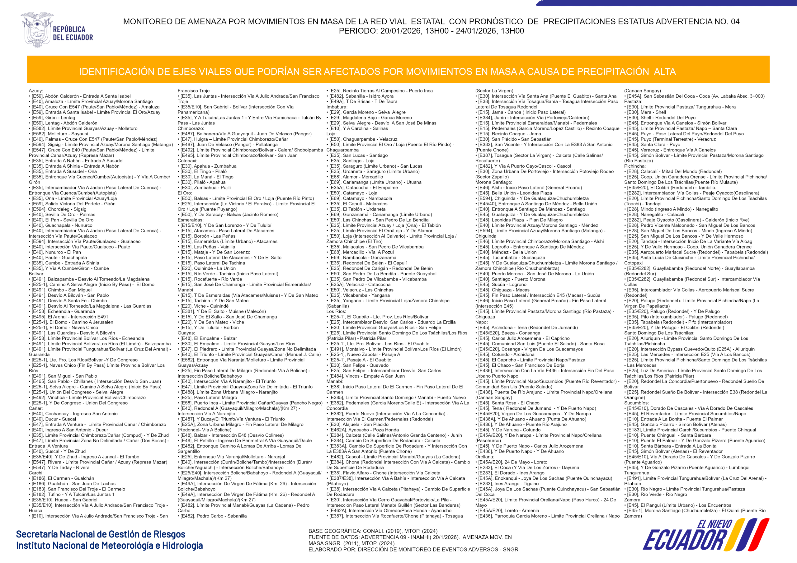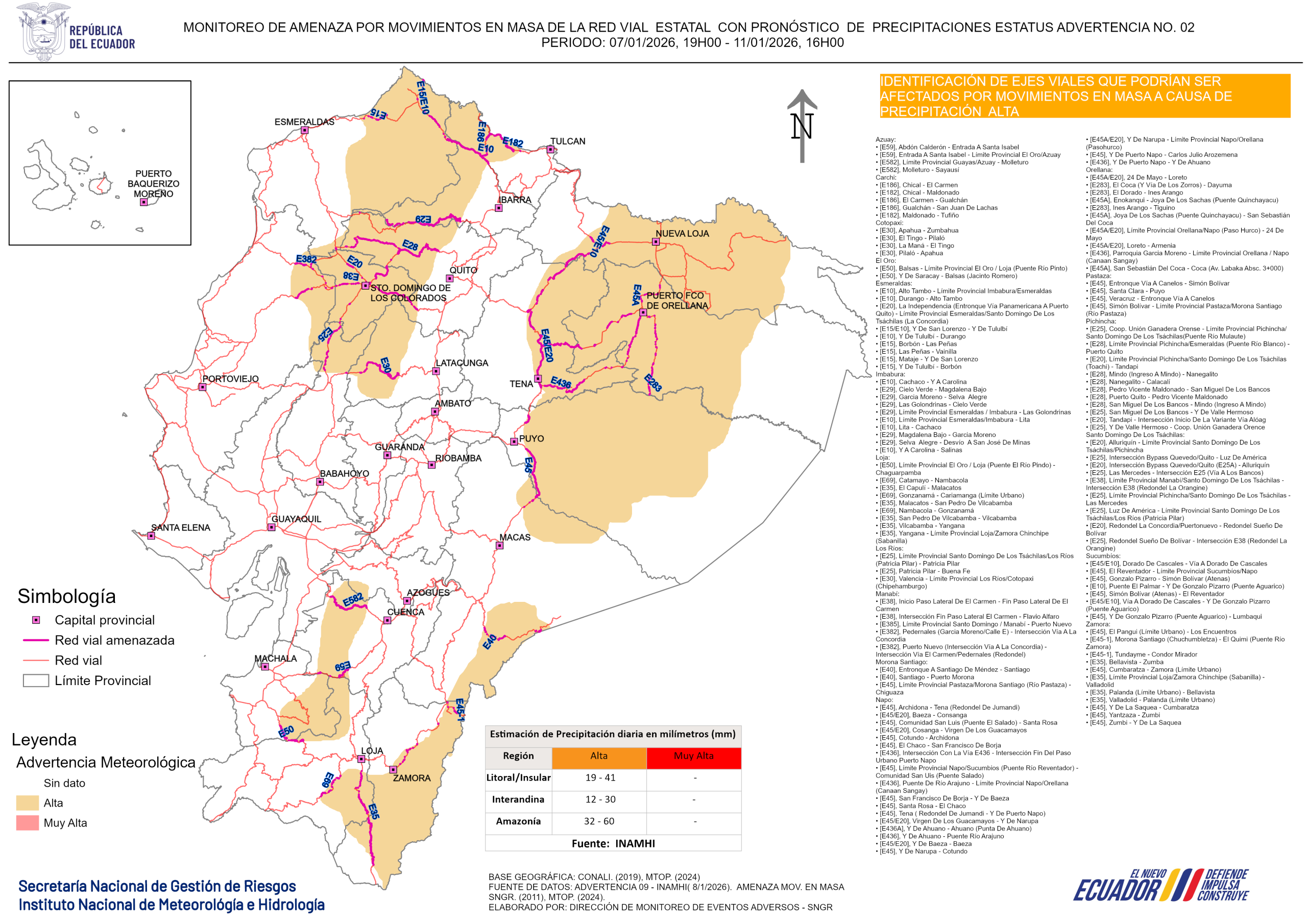 Los mapas de monitoreo de amenaza son generados con boletines hidrometeorólogos estatus advertencia, esta información es facilitada por el INAMHI, más las capas de amenazas de movimientos en masa generados por la SGR, se identifica los ejes viales que podrían ser afectados por movimientos en masa a causa de lluvias.Ejes viales que podrían ser afectado