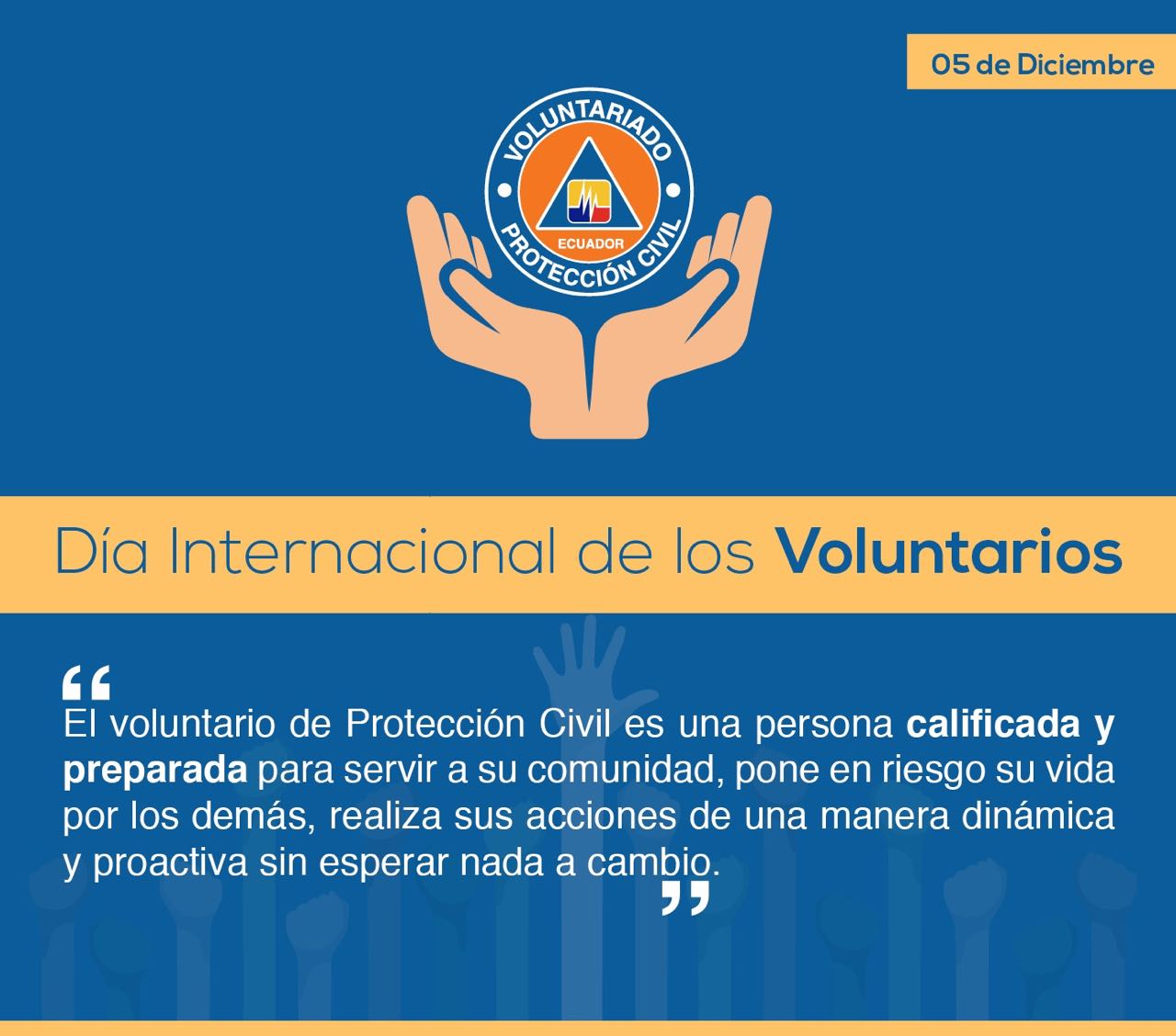 Samborondón (Guayas).- El 17 de diciembre de 1985 la Asamblea General de las Naciones Unidas en la Resolución 40/212 decreta al 5 de diciembre como el día Internacional de los Voluntarios para el Desarrollo Económico y Social e invita a los gobiernos y organizaciones de la sociedad civil a unirse a la celebración de los voluntarios de todo el mundo.